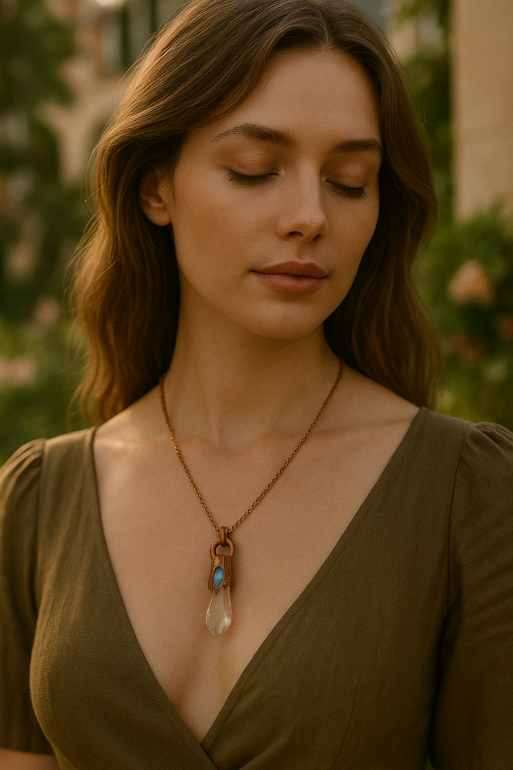Handcrafted copper pendant featuring a luminous labradorite and clear quartz point, electroformed for a raw, earthy charm and powerful healing energy.