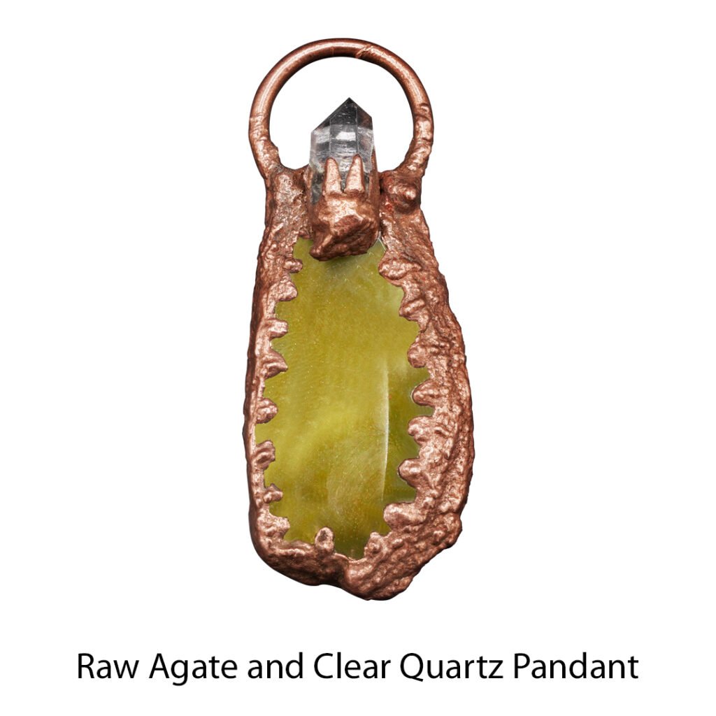 Raw and polished stones wrapped in elegant electroformed settings.