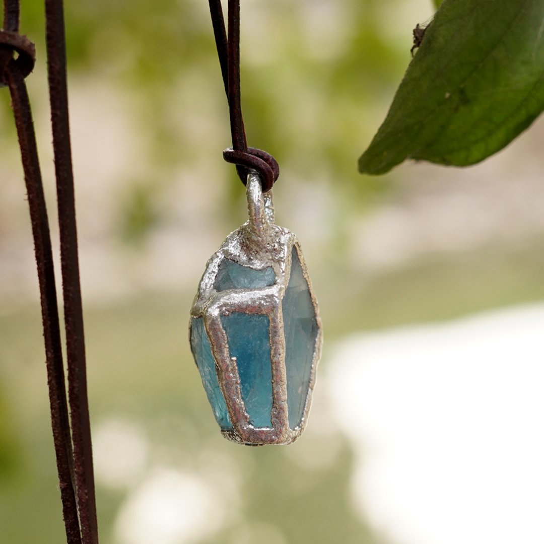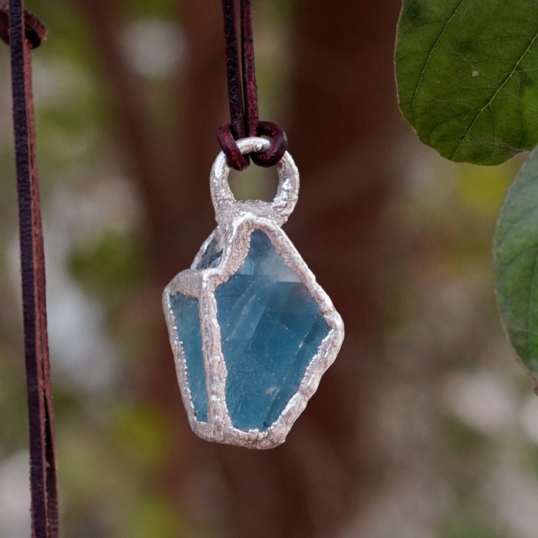 This pendant features a striking blue fluorite crystal preserved through electroforming and finished with a silver‑plated surface.