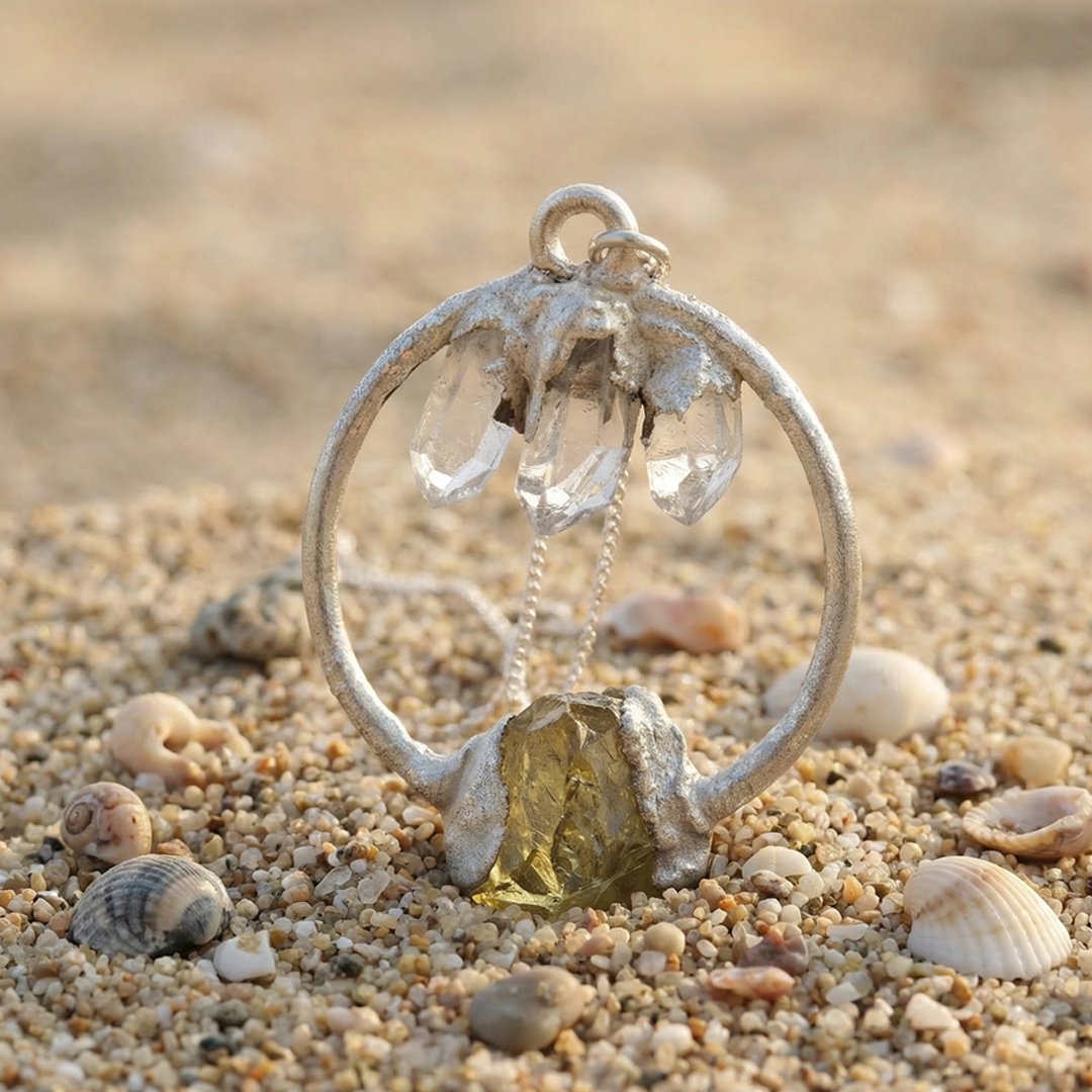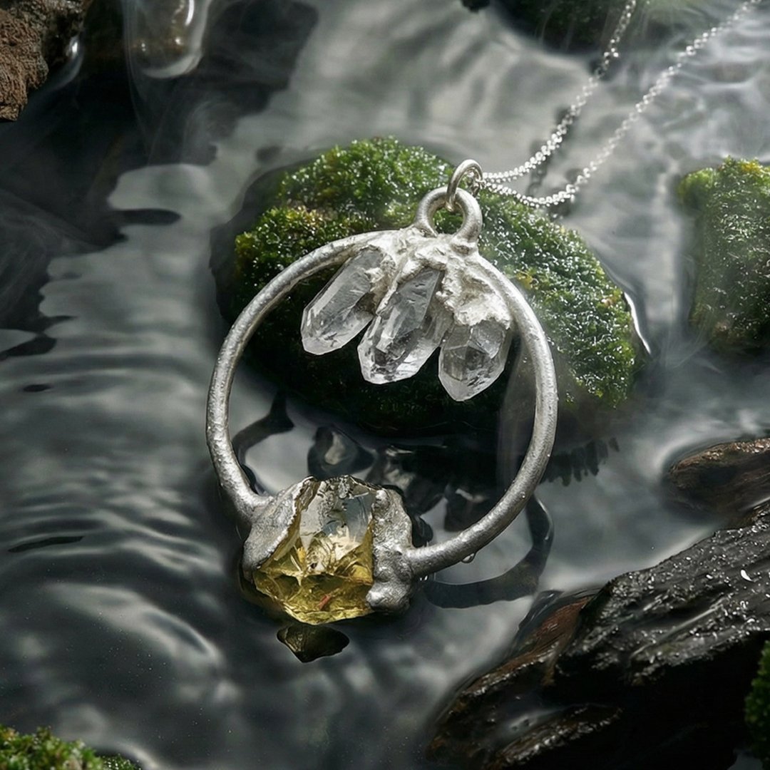 This pendant features citrine or clear quartz preserved through electroforming and finished with a silver‑plated surface.