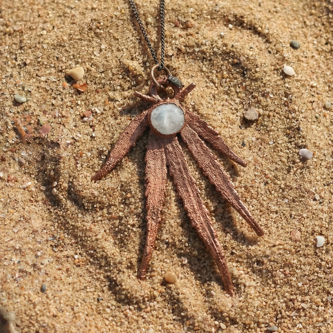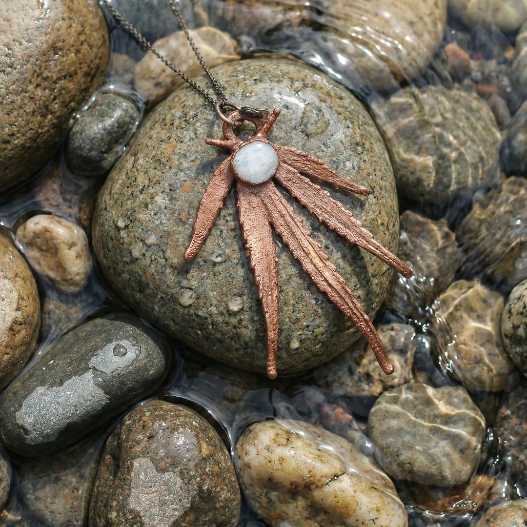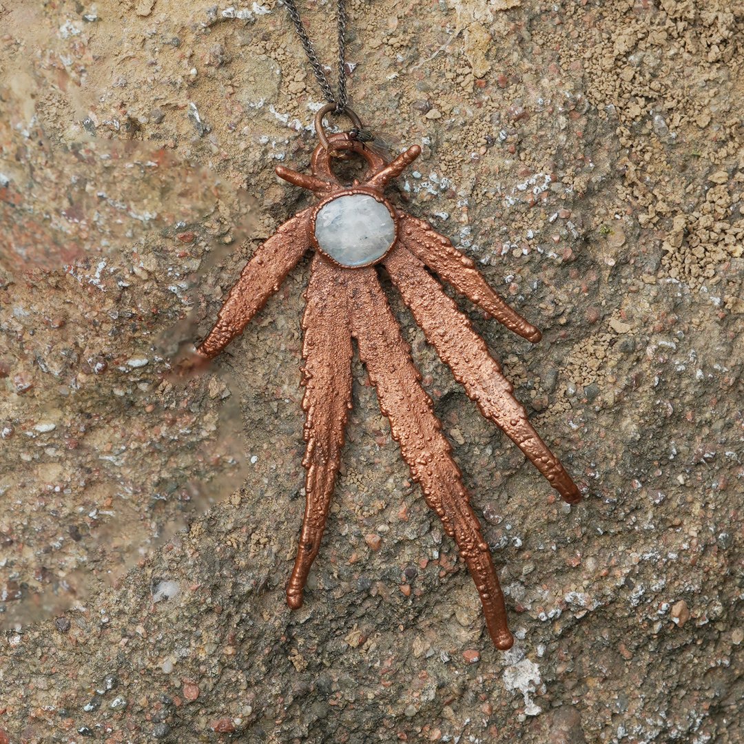 We use copper as the base metal, which is electroformed around natural specimens or stones. Some pieces are finished with silver plating. We also use natural gemstones such as quartz, fluorite, moonstone, and others.