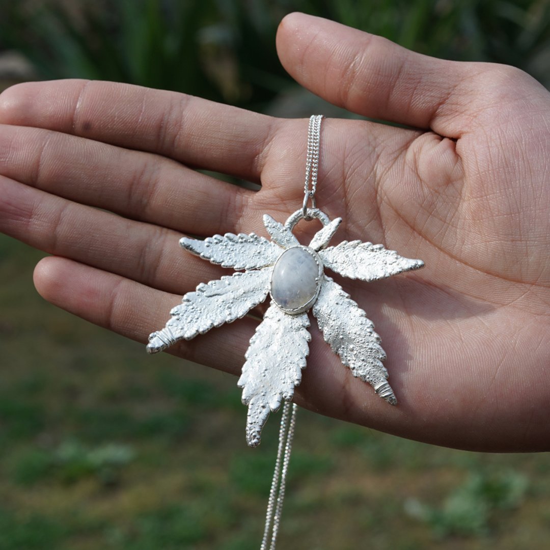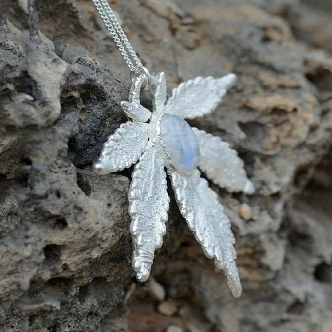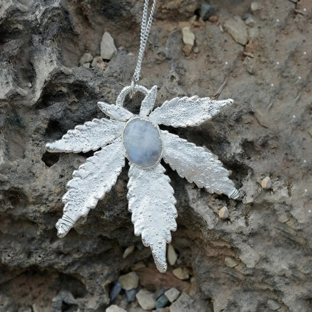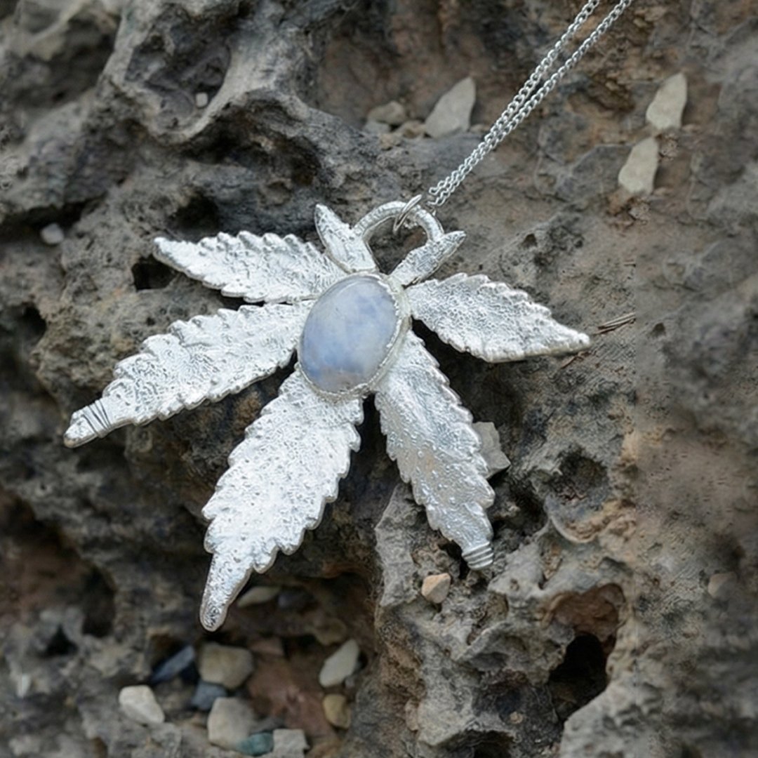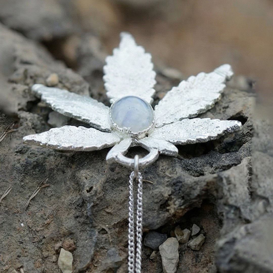 Rainbow moonstone adds a luminous glow that complements the natural textures of the leaf.
