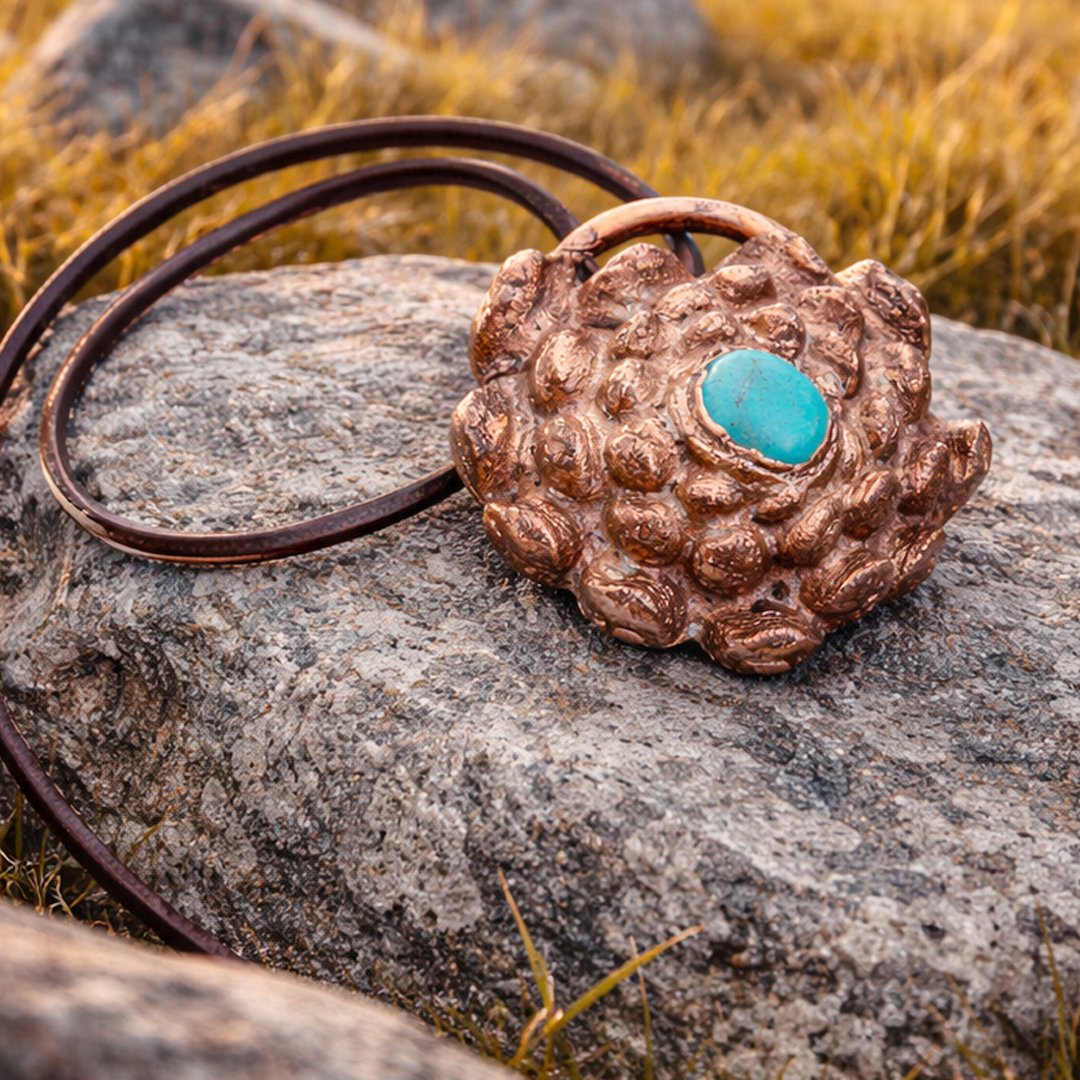 A turquoise gemstone adds vibrant color and contrast, making the pendant visually striking while maintaining its natural inspiration.