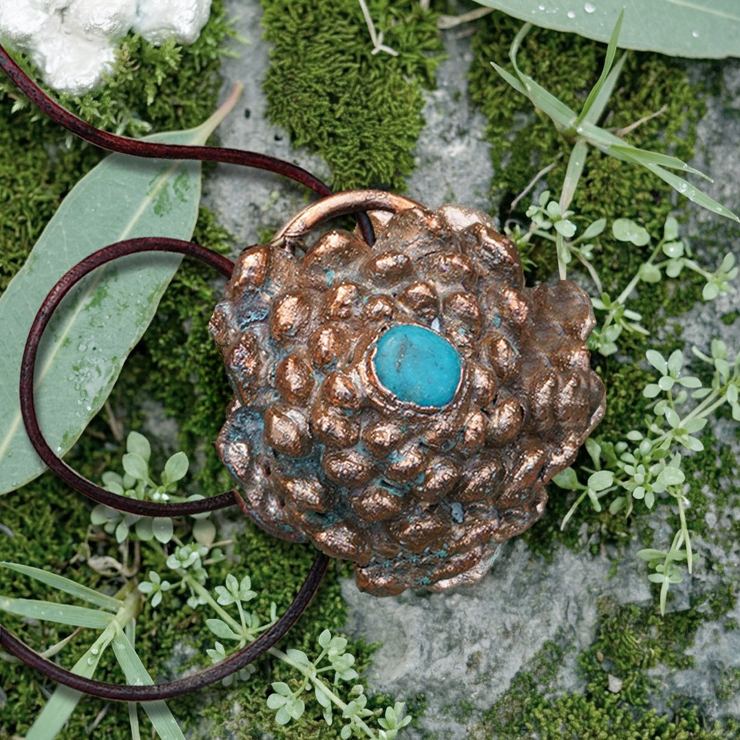 Inspired by forest elements, this pendant captures the organic form of a pinecone preserved through electroforming.