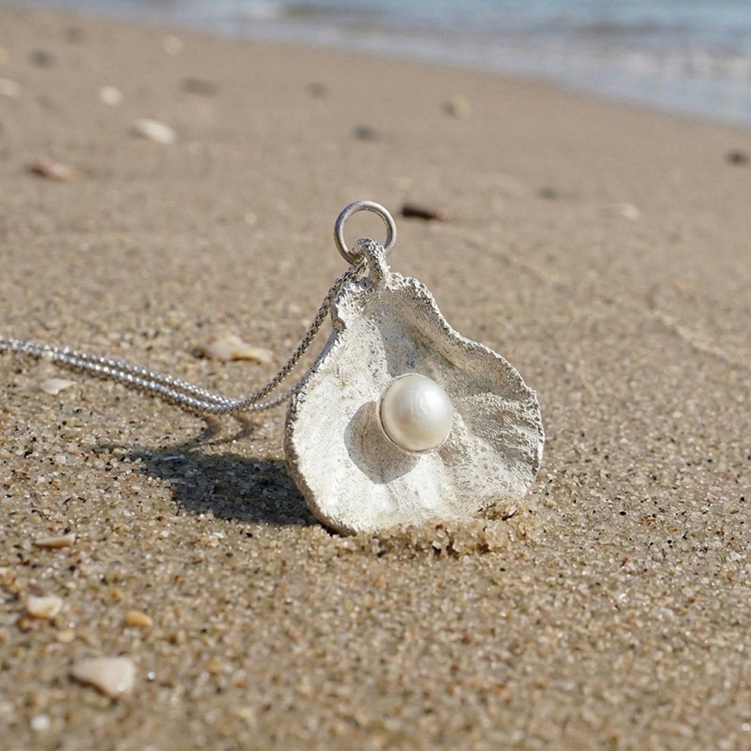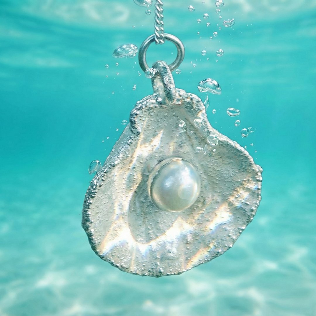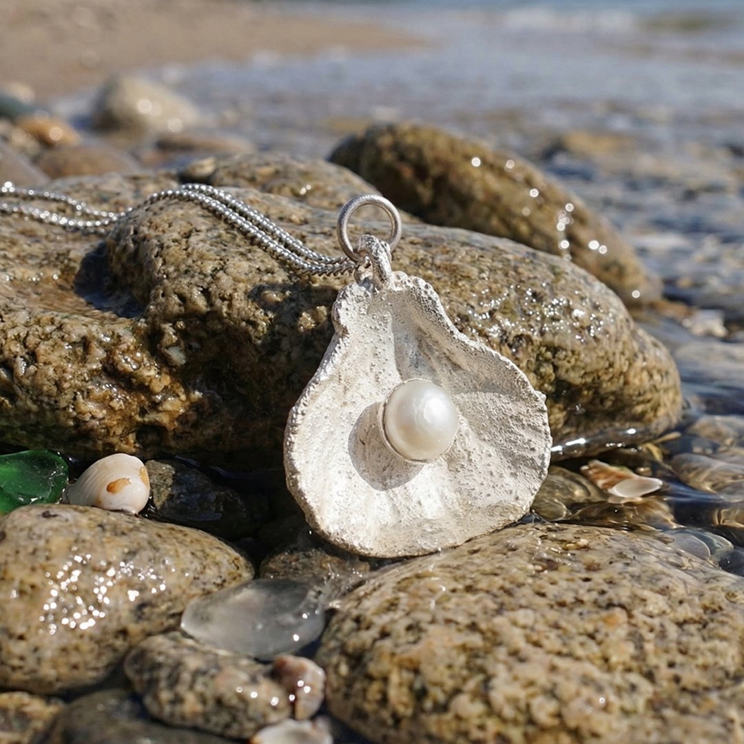 This ocean‑inspired shell pendant is electroformed and finished with a bright silver‑plated surface.