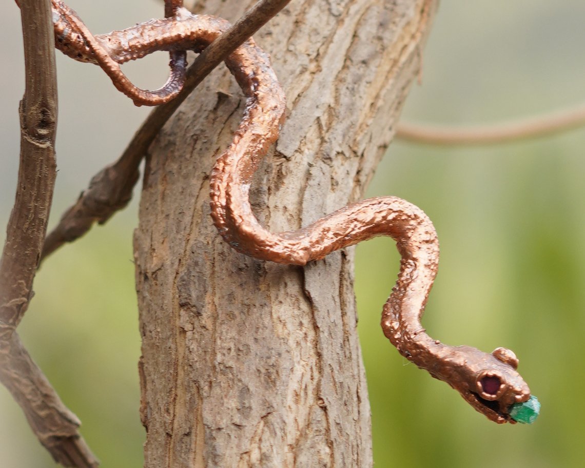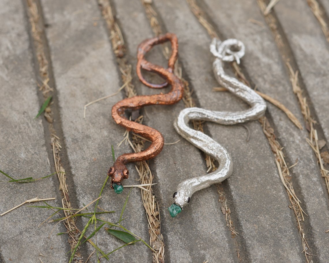 This snake pendant features a preserved snake specimen transformed into wearable art through the electroforming process.